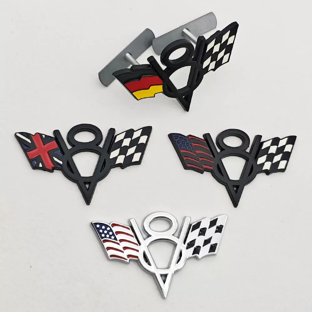- Design: 3D V8 emblem featuring the flags of the US, UK, and Germany for a unique and stylish look.