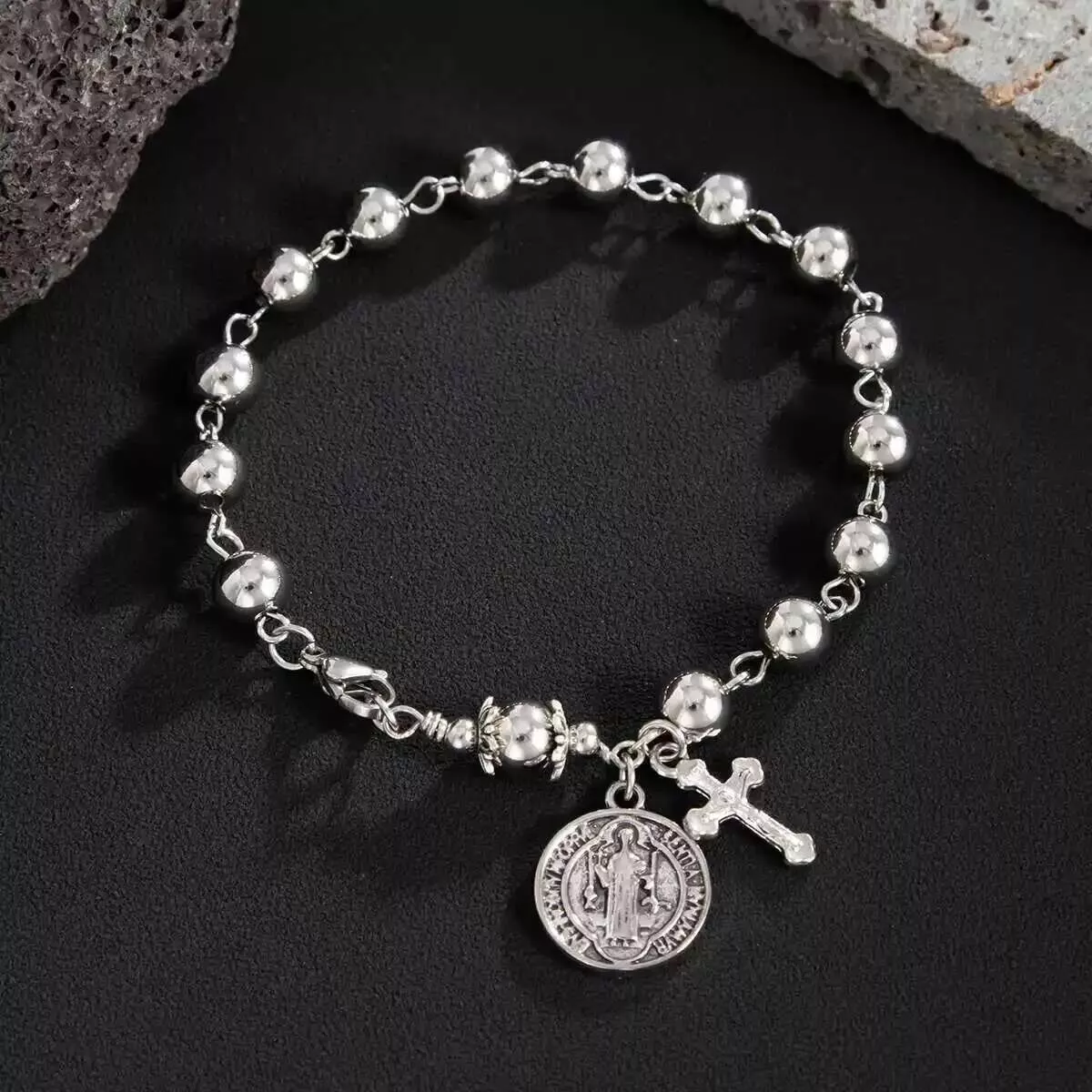 Made from durable stainless steel and zinc alloy, this bracelet ensures long-lasting wear without losing its shine. The smooth round beads feel comfortable against your skin, while the secure cuff style offers easy wear without the hassle of clasps. With a sleek metallic finish and a meaningful pendant, it’s a versatile piece that can be worn alone for a subtle statement or layered with other accessories for a bolder look.