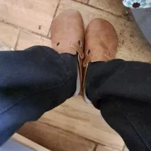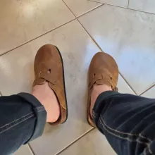 Love everything about these mules – especially how effortlessly chic they make me feel every time I step out in them! The amber crazy horse leather is simply stunning, aging beautifully over time and lending a unique vintage patina. The round-toe slip-on design adds to their laid-back appeal while the adjustable antique buckle ensures a perfect fit every single time. And the comfort? Unbeatable! Thanks to that thick EVA cork sole, my feet feel supported all day long.
