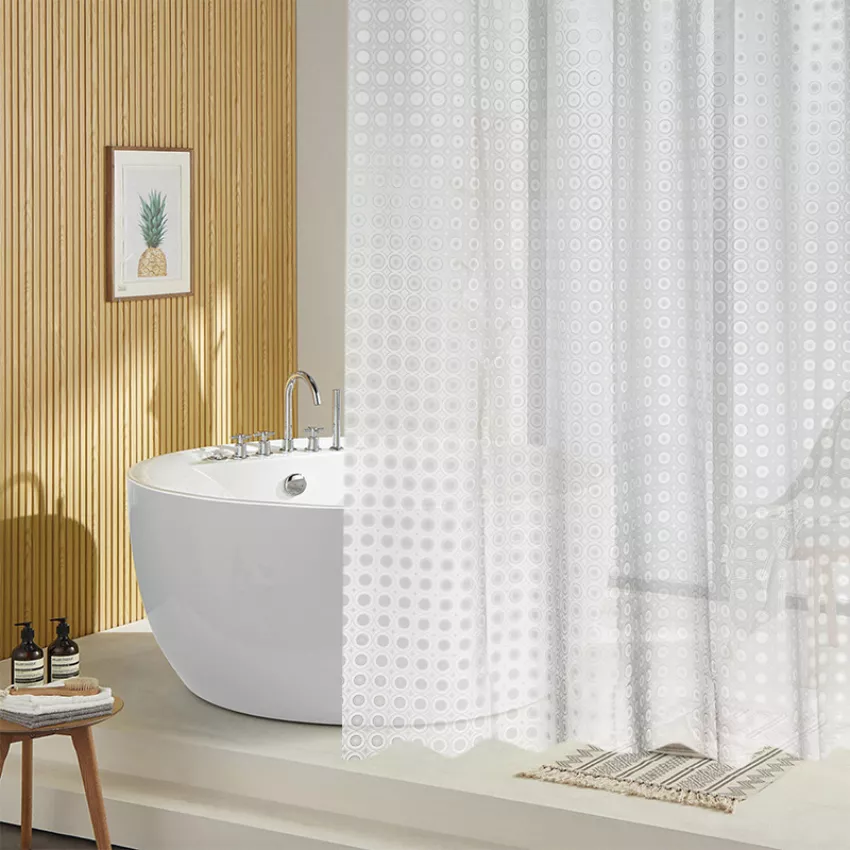Transform your bathroom into a sleek, modern space with this Waterproof Geometric Shower Curtain Liner. Designed with a clean, translucent pattern of circles, this 71 by 71 inch curtain brings both elegance and practicality to your bathing area. Crafted from durable, eco-friendly PEVA material, it offers a waterproof barrier to keep your bathroom dry and fresh, making it an essential addition to any tub or shower setup.