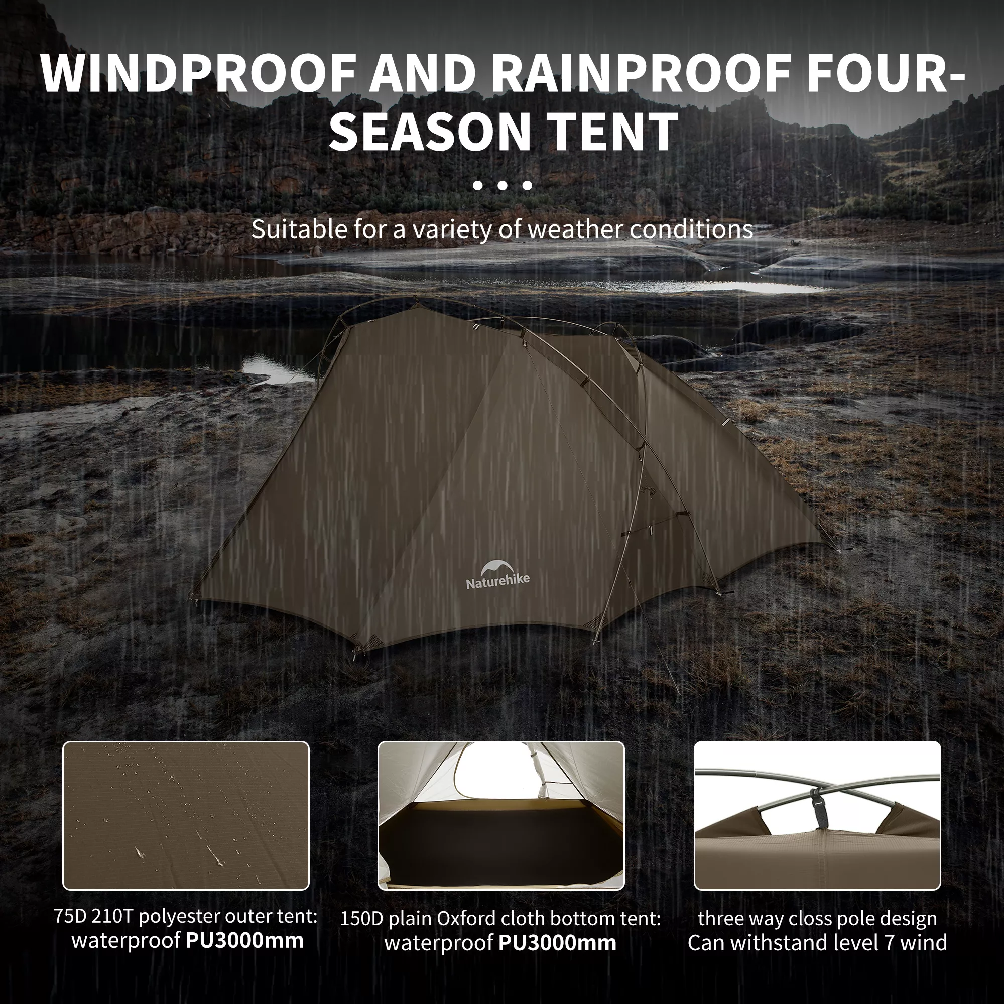 - Waterproof rating over 3000 mm for both roof and floor