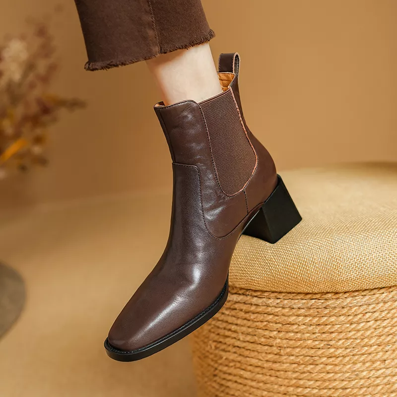 These ankle boots combine functionality with fashion. The hand-stitched detailing adds a unique touch, while the sturdy square heel provides stability without sacrificing style. The elastic side band enhances flexibility, ensuring a snug fit for all-day comfort. These boots are not just essential—they’re a statement piece for every outfit. Pair them with dresses, skirts, or skinny jeans to instantly elevate your look. The timeless design ensures they remain a staple in your wardrobe season after season.
