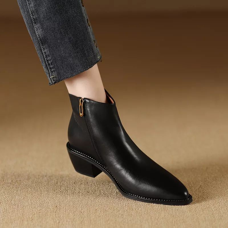 Elevate your wardrobe with these stunning women’s ankle boots, designed for both comfort and fashion. Crafted from genuine cow leather, these boots offer a luxurious feel that molds perfectly to your feet over time. The pointed toe adds a chic and sophisticated touch, while the chunky square heel gives you the perfect balance of style and stability. Whether you’re strolling through the city streets or heading out for a casual evening, these boots make every outfit shine.