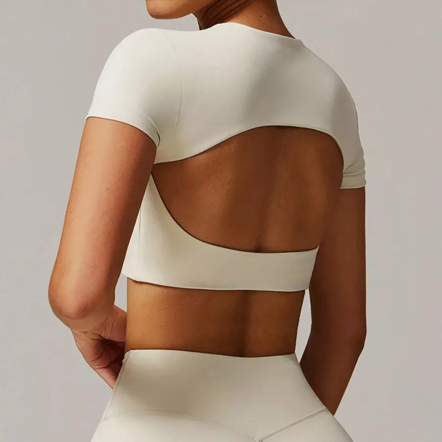 Women’s Sexy Hollow Back Yoga Top – Breathable Short Sleeve Workout Shirt