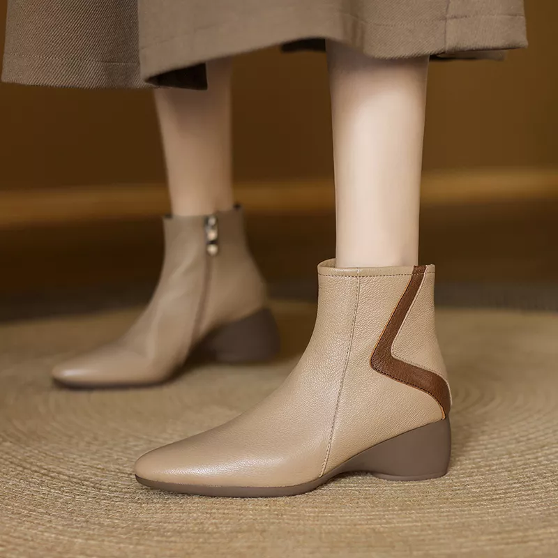 Upgrade your wardrobe with these elegant ankle boots designed to combine fashion and functionality. With a classic round toe and a comfortable square high heel, these boots are perfect for adding a touch of sophistication to any outfit. The genuine cow leather upper and soft short plush lining ensure warmth and durability, keeping your feet cozy during chilly days. Designed with a sleek zipper, these boots are easy to slip on and off, offering convenience without compromising style.