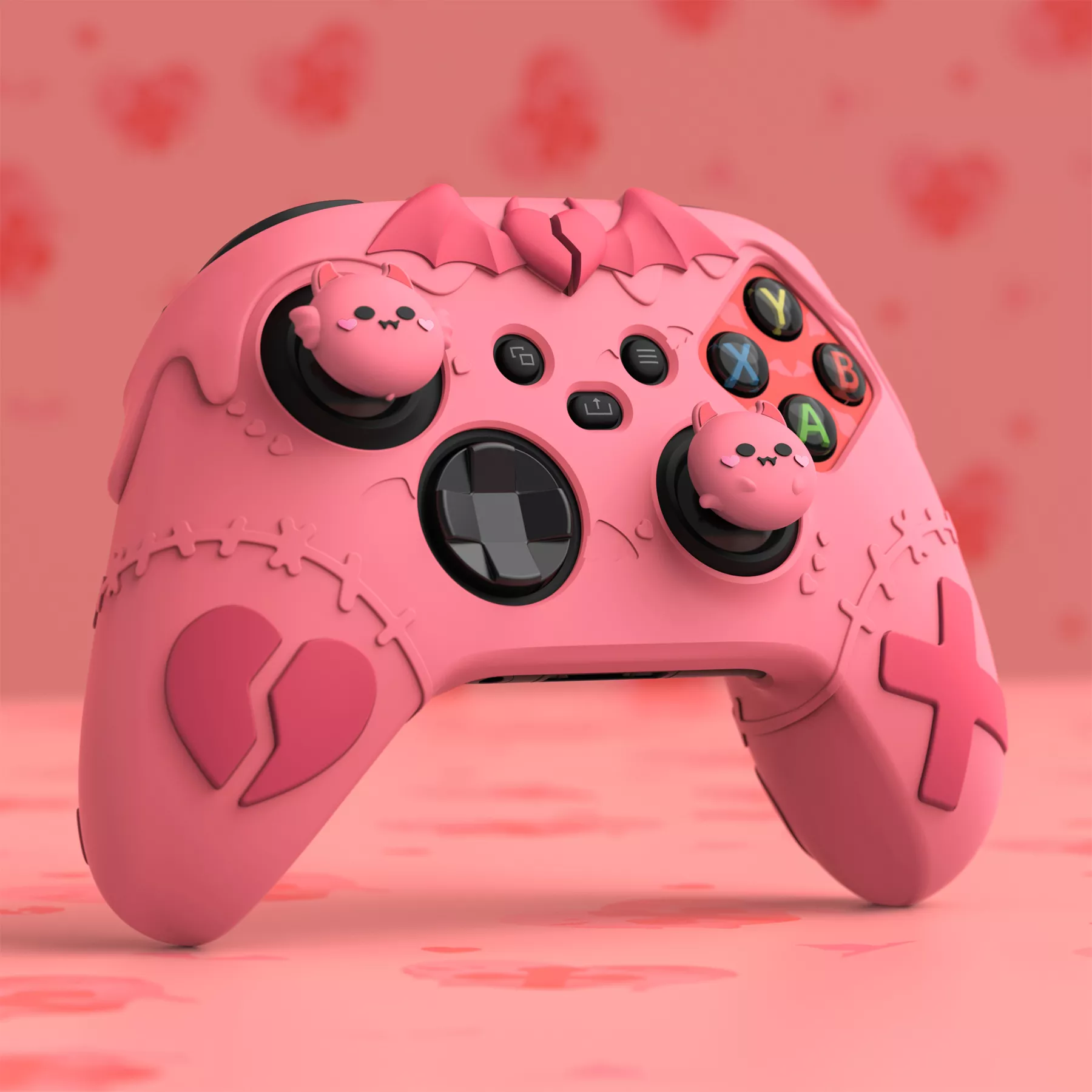 Transform your Xbox Series X or S controller into a statement piece with the Gothic Imp Peach Pink Silicone Case. Designed for gamers who love unique style and reliable protection, this silicone cover features intricate broken hearts, stitched details, and crosses, giving your controller a spooky yet adorable personality. The themed joystick caps and bat-winged heart logo complete the gothic look, making your gaming setup stand out.